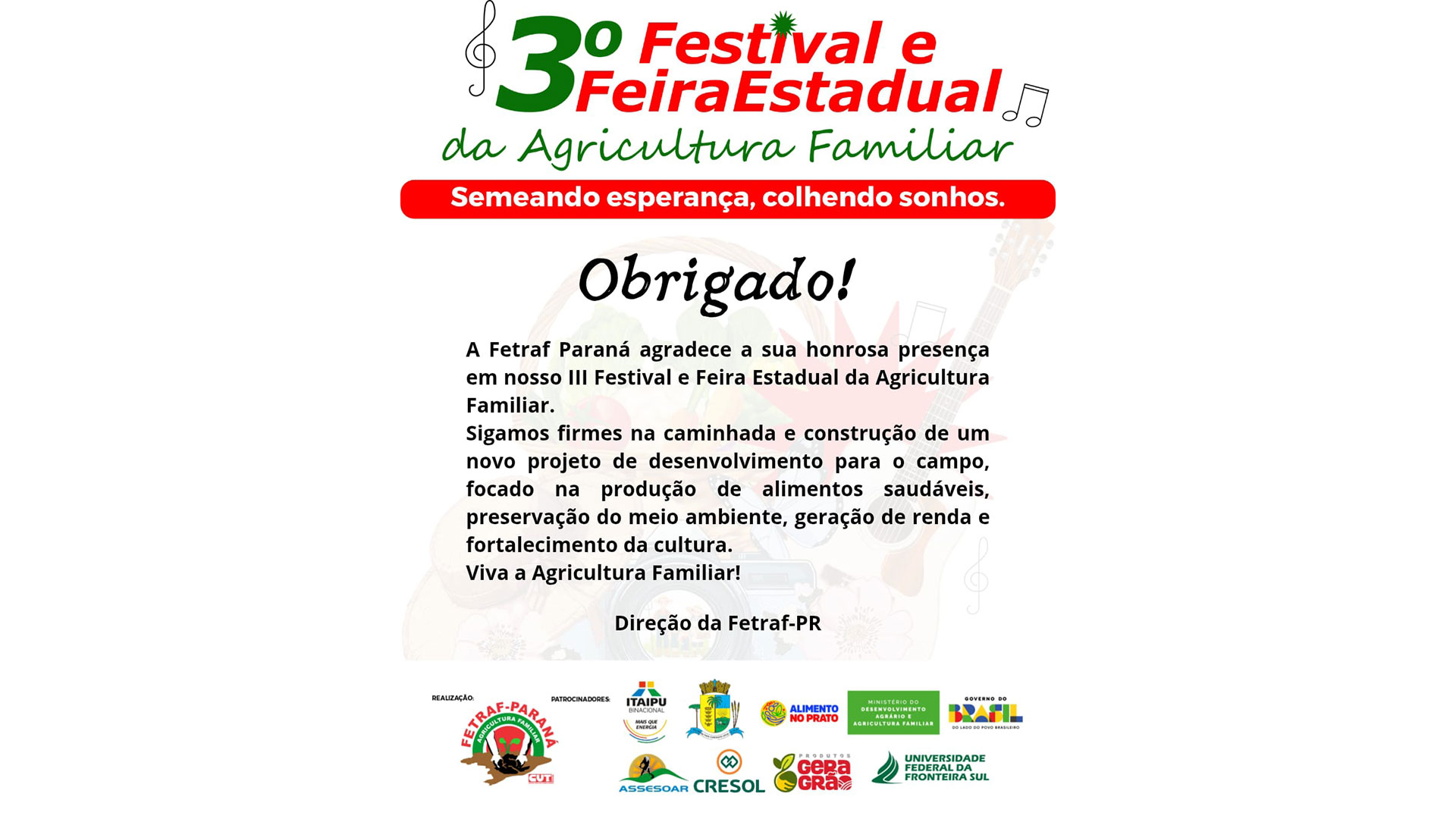 Vem aí o concurso de fotografias, intitulado “Agricultura Familiar em destaque”, com o objetivo central de identificar e mostrar para a sociedade, os tipos de agricultura familiar que temos em nosso estado, bem como, a diversidade de alimentos produzidos em cada região, seus desafios e perspectivas.