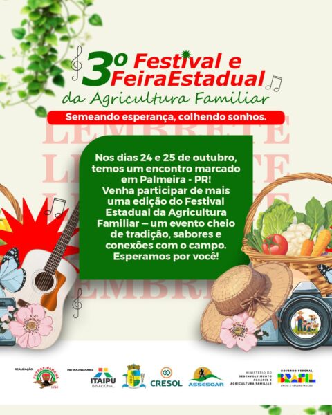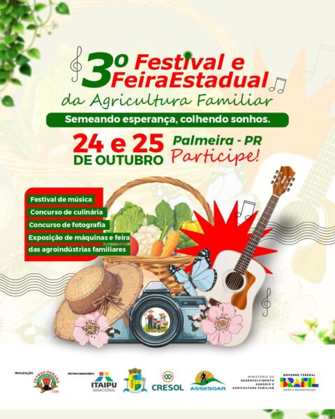 👏Além dos concursos de música, culinária, fotografia e feira de alimentos, neste ano, a novidade será a feira de máquinas e equipamentos para a Agricultura Familiar.